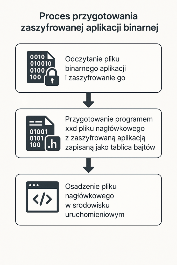 CKolejnym krokiem po zaszyfrowaniu pliku binarnego jest przygotowanie pliku nagłówkowego z tablicą zawierającą aplikację jako tablicę bajtów. Przygotowujemy go wykorzystując aplikację xxd z flagą -i. Nazwa tablicy oraz zmiennej są odpowiednio encrypted_binary i encrypted_binary_len – są to nazwy, wynikającej z nazwy pliku binarnego, który „osadzamy” w tablicy. Jak dokładnie się to wykonuje możecie podejrzeć w skrypcie bash’a: